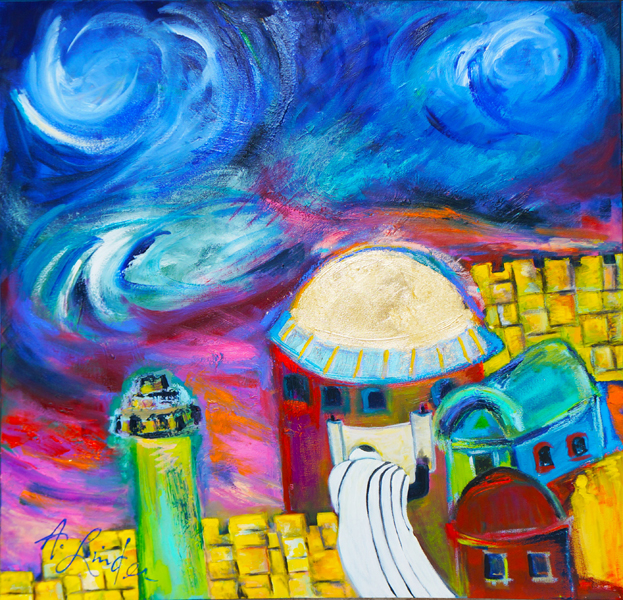 Storm clouds loom over the city of Jerusalem and a rabbi raising the Torah. Arlene said the tumultuous sky represents the political unrest and general turmoil plaguing the region.
